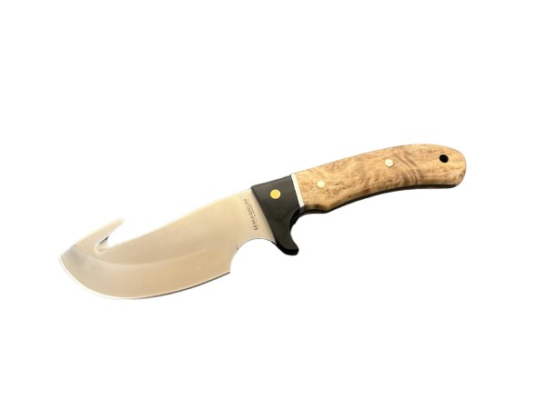 A functional and stylish hunting knife with a 440 stainless steel blade and rosewood/root wood combination handle. Includes a dark brown leather sheath. Blade length: 4 1/3". Overall length: 8 5/8". Weight: 5.5 oz.