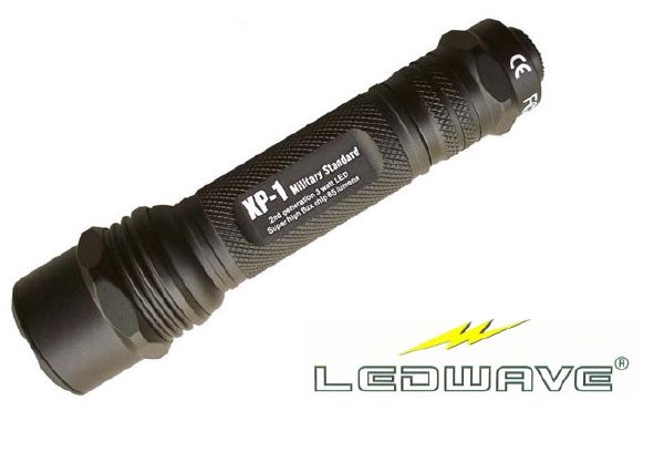 The Ledwave XP-1 does not work with a conventional illuminant but with an LED (light-emitting diode). The big advantages of the LED are a significantly longer life span of the light emitting portion (approx. 50.000 hrs), a higher light yield and a by far smaller energy consumption than incandescent bulbs, such as Xenon-bulbs. The XP-1 Trooper features a 3-Watt LED of the 2nd generation. The LED is controlled by a specially developed circuit, called Super-High-Flux-Chip, for optimizing the overall performance as optimum battery and bulb life and maximum light output of the flashlight.