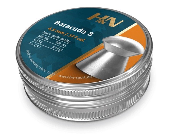 With a weight of 0.55 gram / 8.44 grain, the H&N Baracuda 8 is a lightweight addition to the range of Field Target and Hunter Field Target pellets in the calibre 4.5 mm / .177.
