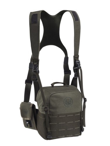 The Beretta Modular Binocular Harness. Holds 10x42 and 8x56 binoculars. Fully adjustable padded shoulder straps. Easy one-hand opening. Laser-cut MOLLE panels on the front, sides and bottom. Safety straps for the binoculars. Shock absorbing EVA inserts. Fitted with an elasticated laser rangefinder pocket with MOLLE interface.